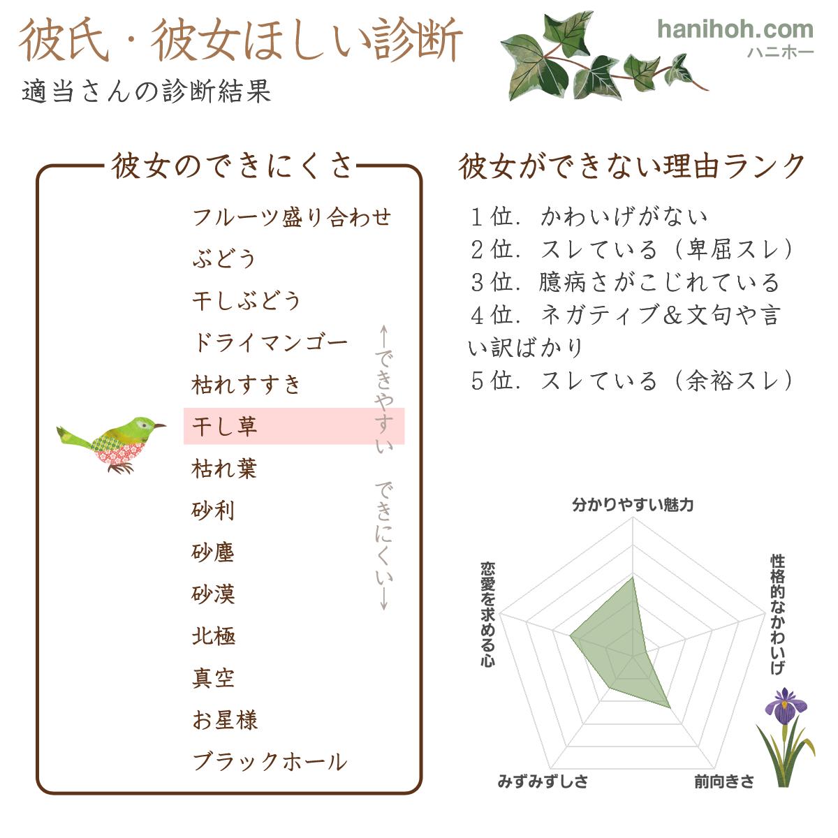 ぴえん侍さんの「彼氏のできにくさ」を診断しました。下記の詳細をご覧ください。